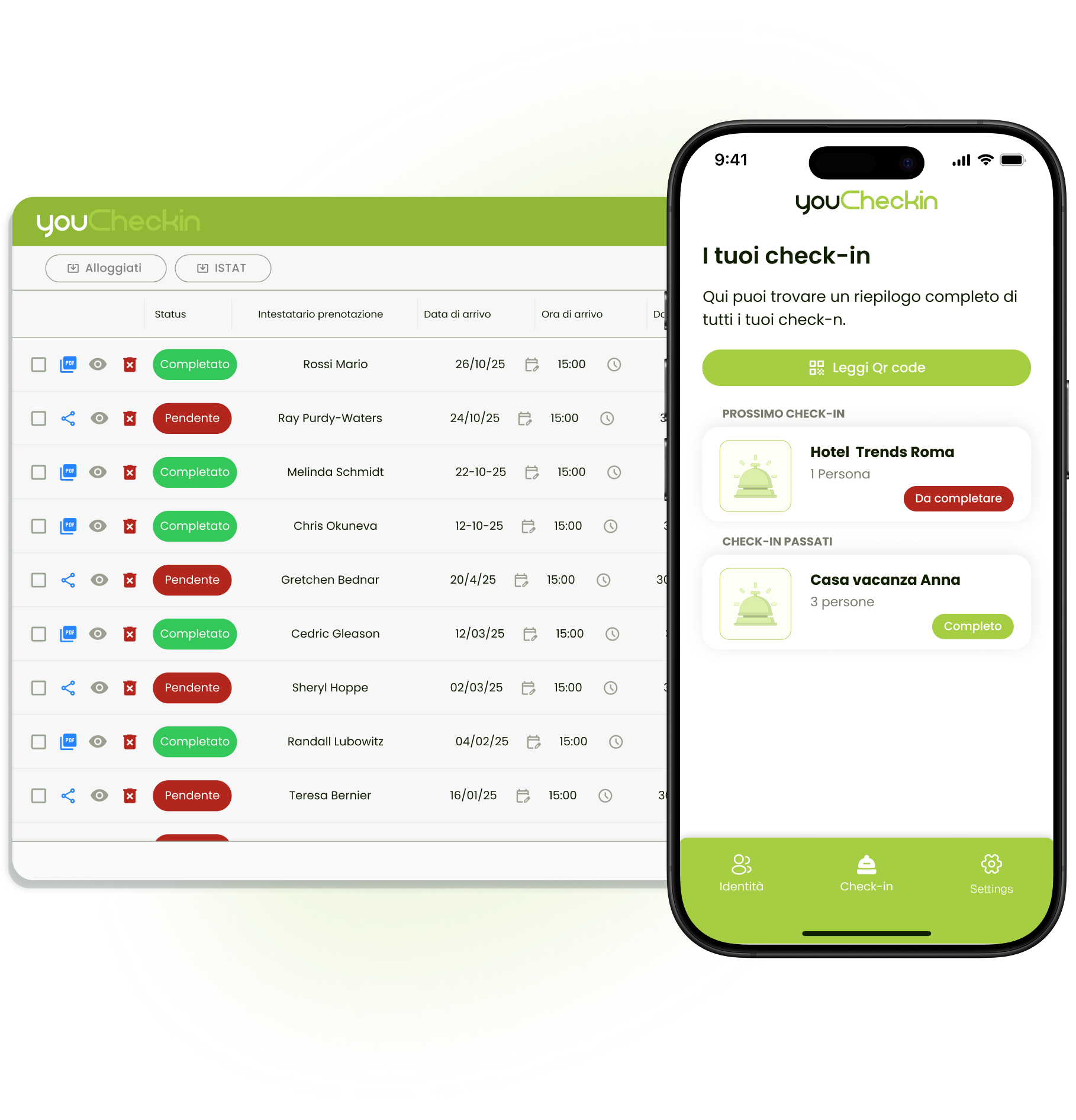 Con youCheckin, offri ai tuoi ospiti un’esperienza moderna e senza attese, mentre la tua struttura risparmia tempo e riduce la gestione manuale. L’innovazione che migliora il soggiorno parte dal primo contatto.